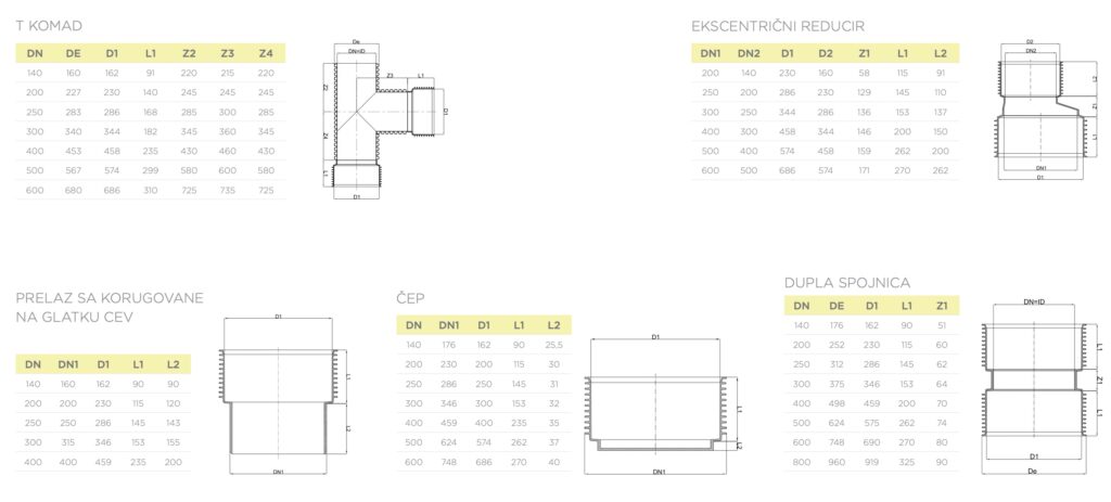 Sastavni deo svakog cevnog sistema su pripadajući fitinzi. U ponudi imamo ceo program spojnih elemenata i fitinga u koje spadaju: račve, lukovi, redukcije, prelazni komadi, poklopci (čepovi), spojnice, slivničke šahte.