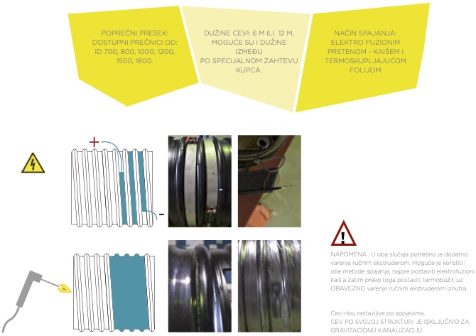ili polipropilena sastoje se od unutrašnjeg glatkog zida i spoljašnjeg korugovanog spiralnog zida. Cev se proizvodi namotavanjem profilisanog spoljašnjeg sloja (ojačanja) sa korugovanim profilom na glatki unutrašnji sloj koji je ekstrudiran i varen u kontinuitetu.